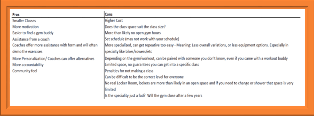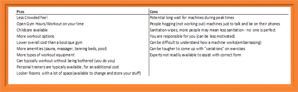 And if you are like me and my husband, you may wonder if you are a big box gym person or a boutique gym person, and it took a long time for my husband and I to decide, so with research, personal experience (working and being a customer) and the help of my husband I was able to come up with the pros and cons of both. And yes, we have done both big box gyms and boutique gyms.