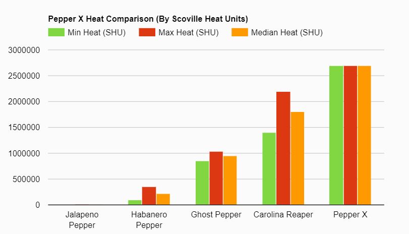 Per the creator, Pepper X is about 2.693 million Scoville Heat Units and has a sweet and floral aroma that opens up to intense flavor. So, how does it compare to others or let me give you a common reference point, the common jalapeño in comparison the Pepper X is up to 1,077 times hotter than the mildest jalapeño, which is about 336 times hotter.